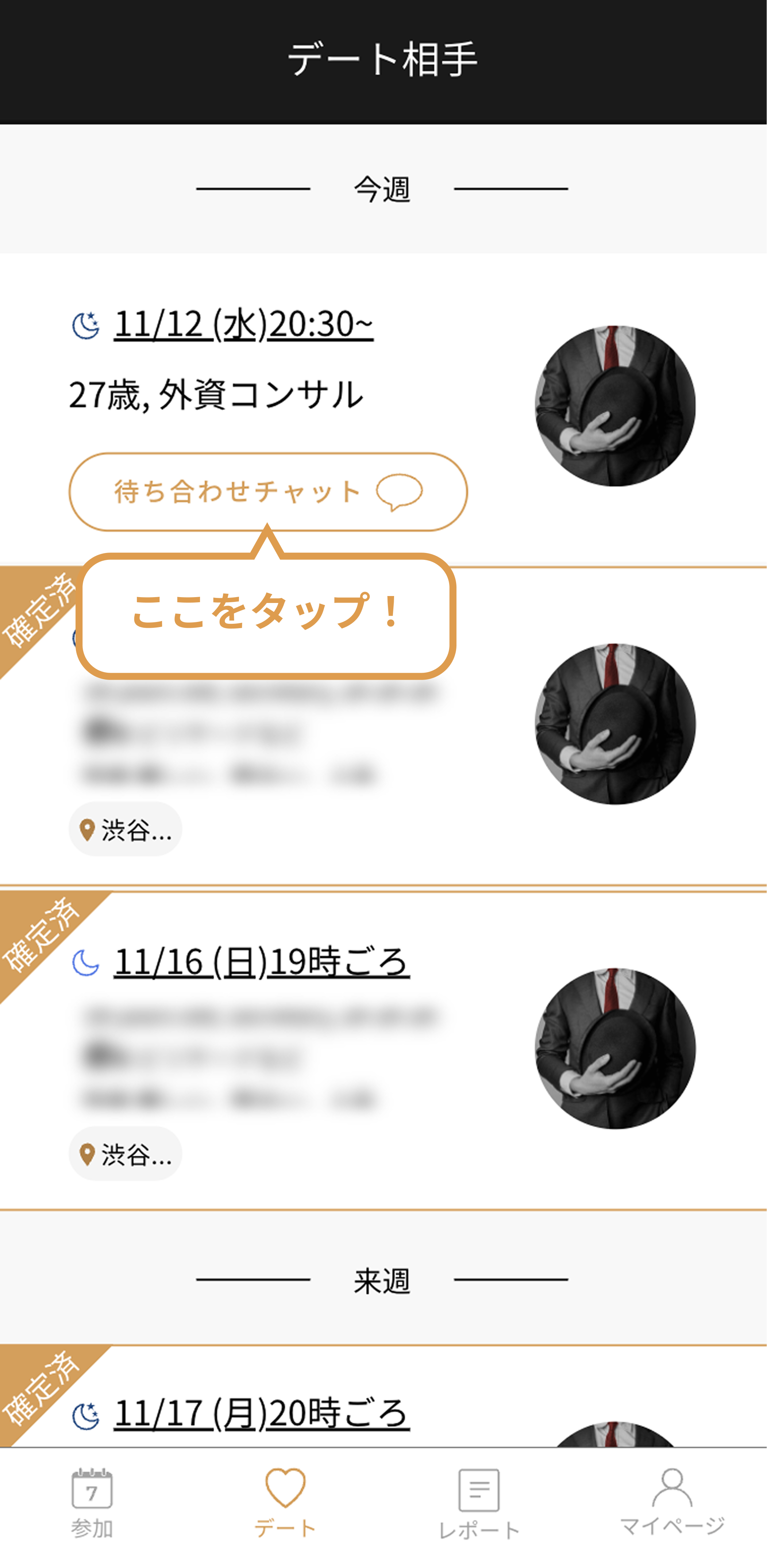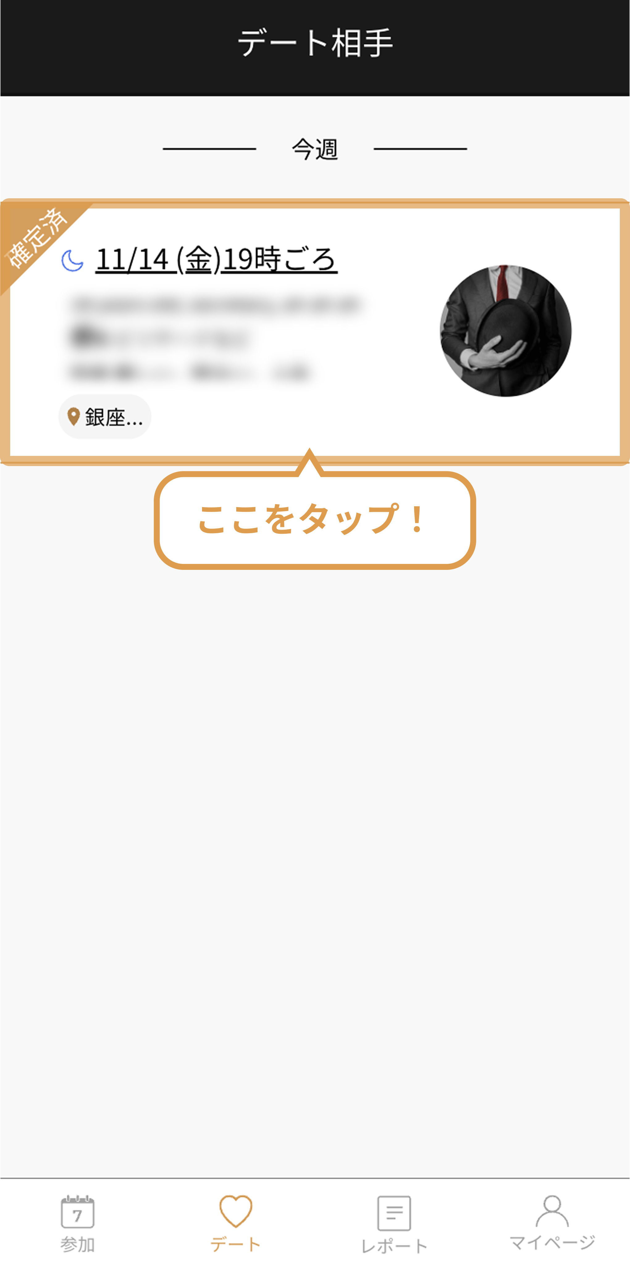 ①デートタブを開いて、キャンセルしたいデート日程をタップ